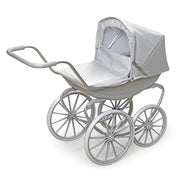 Charming doll pram with 10 and 12 inch wheels · Includes padded mat and pillow and boot cover · Adjustable canopy and padded handle